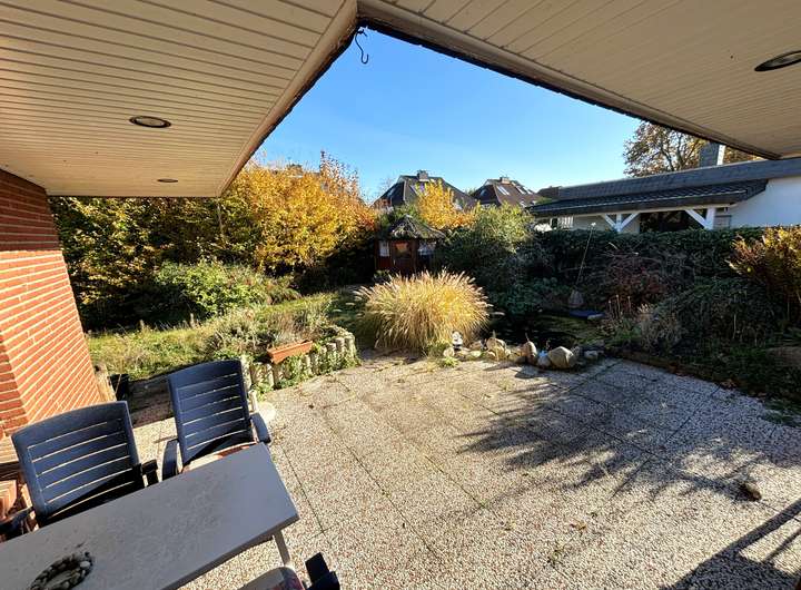 Von der geschützten Terrasse im Knick des Hauses hat man einen wunderbaren Blick in den blickdichten Garten und auf den kleinen Teich mit Wasserfall, der durch sein Plätschern die ruhige, angenehme Atmosphäre noch verstärkt.