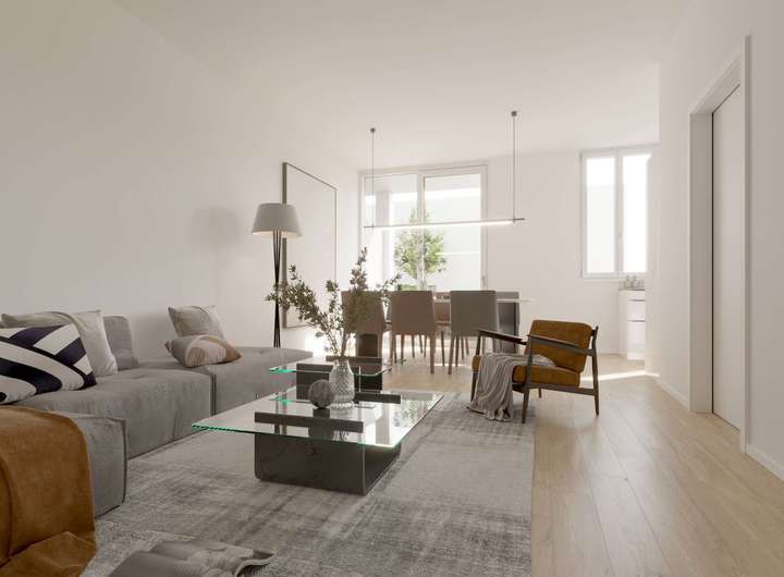 Im Erdgeschoß des Mehrfamilienhauses erwartet Sie eine Garage mit 9 ebenerdigen Stellplätzen, Fahrradabstellmöglichkeiten sowie eine kleine Gewerbeeinheit mit 127qm Gewerbefläche über 2 Ebenen (EG und KG). Über das Treppenhaus oder schwellenfrei mit dem Aufzug erreichen Sie das 1. Obergeschoß, das Dachgeschoß und die Penthousewohnung. Die drei Wohnungen im 1. OG mit 2-3 Zimmern und Wohnflächen von ca. 79,40qm bis zu ca. 89,08qm verfügen alle über Tageslichtbäder und große sonnige Terrassen.