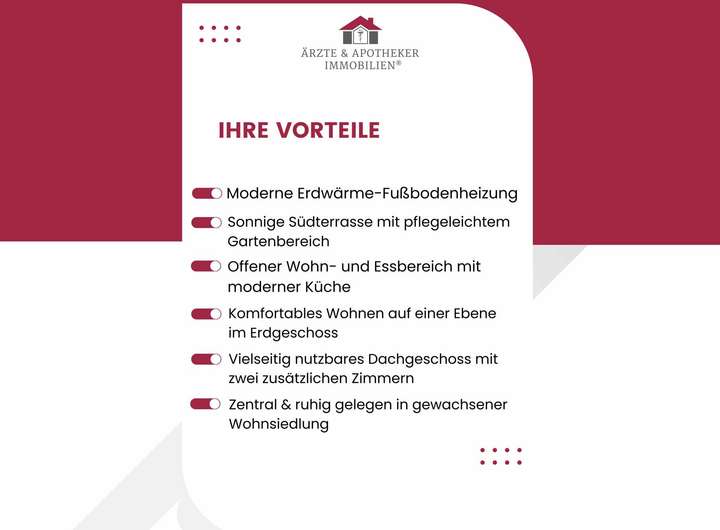 Der Außenbereich überzeugt mit einer sonnigen Südterrasse, einem pflegeleichten Garten und einem eigenen Pkw-Stellplatz. Beheizt wird die Immobilie über eine moderne Erdwärme-Fußbodenheizung, die nicht nur für wohlige Wärme sorgt, sondern auch langfristig Energiekosten spart.