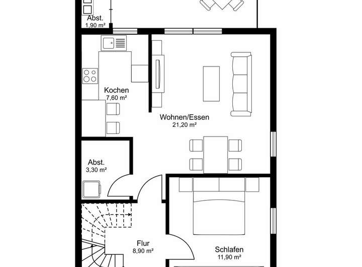 Im Erdgeschoss erwartet Sie ein großzügiger Wohn- und Essbereich mit offener Küche – der kommunikative Mittelpunkt des Hauses. Ein gemütliches Schlafzimmer sowie ein helles Tageslichtbad mit ebenerdiger Dusche bieten Komfort auf einer Ebene. Ergänzt wird das Raumangebot durch ein separates Gäste-WC und einen praktischen Abstellraum.