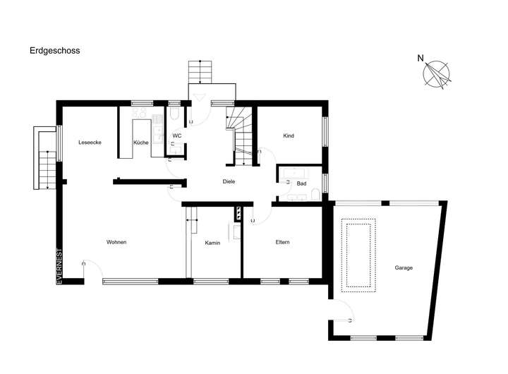 Im Erdgeschoss empfängt Sie eine großzügige Diele mit praktischem Einbauschrank. Das helle Wohn- und Esszimmer öffnet sich zum Garten und führt direkt auf die Terrasse. Ein separates Kaminzimmer sorgt für eine gemütliche Atmosphäre und lädt zum Verweilen ein. Außerdem finden sich auf dieser Ebene ein Tageslicht-Gäste-WC, ein Badezimmer mit Badewanne, zwei flexibel nutzbare Zimmer – ideal als Kinder-, Gäste- oder Arbeitszimmer – sowie eine funktionale Küche, die sich mit wenig Aufwand modernisieren lässt.
