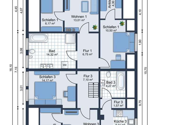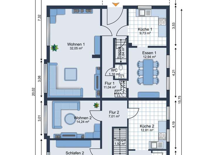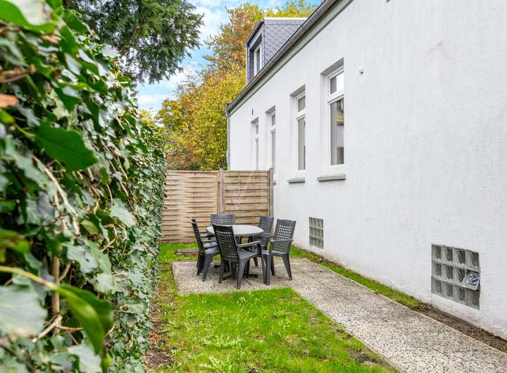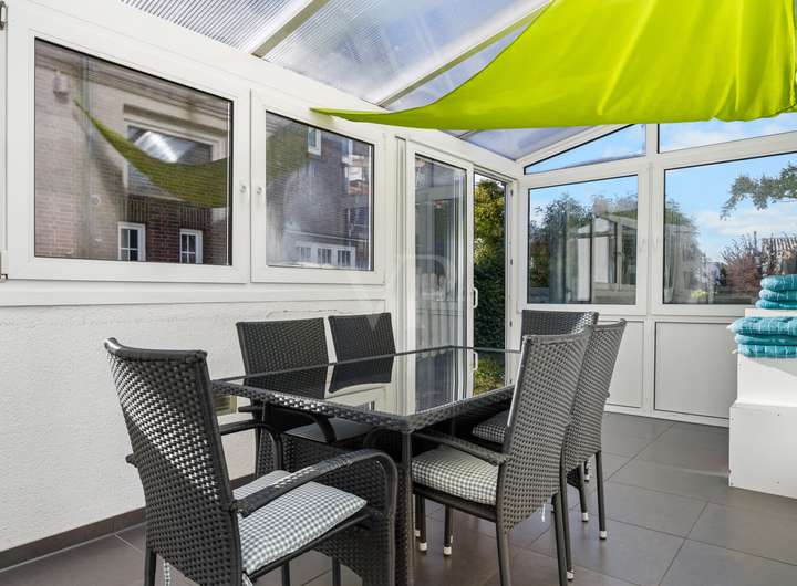 Auf rund 244 m² Wohnfläche präsentiert sich die Stadtvilla als Doppelhaushälfte mit drei eigenständigen Wohneinheiten. Die linke Hälfte umfasst eine großzügige Wohnung mit ca. 120 m², während sich auf der rechten Seite zwei separate Einheiten mit jeweils rund 60 m² im Erd- und Obergeschoss befinden, offiziell als Ferienwohnungen genehmigt. Jede Einheit überzeugt durch klare Grundrisse und helle, freundliche Räume. Hinter dem Haus liegen Terrassen, die zu entspannten Stunden im Freien einladen. Die linke große Wohneinheit verfügt über einen überdachten Eingangsbereich mit Sitzmöglichkeiten, die rechte Seite über einen kleineren, geschützten Zugang.