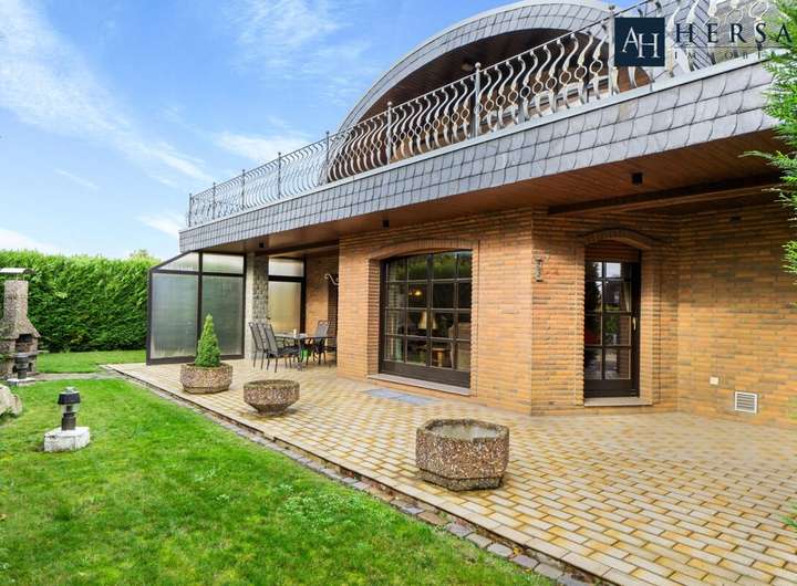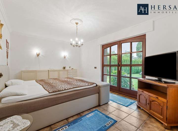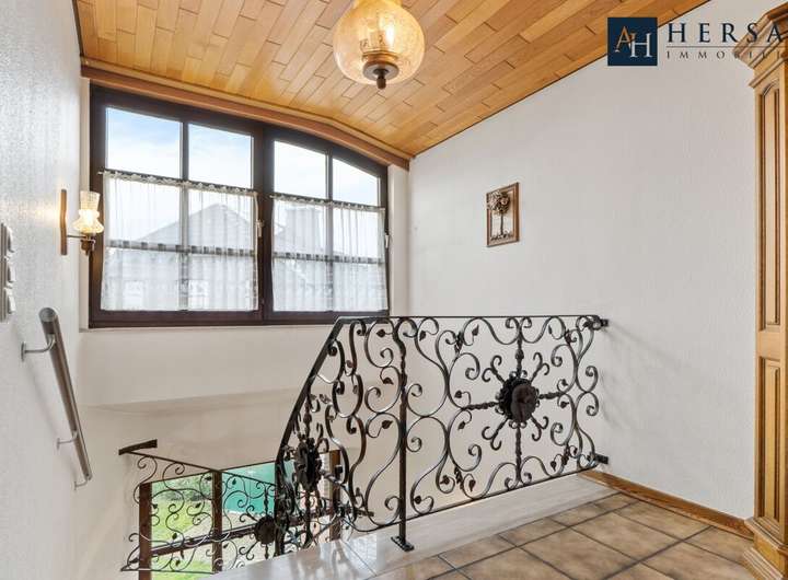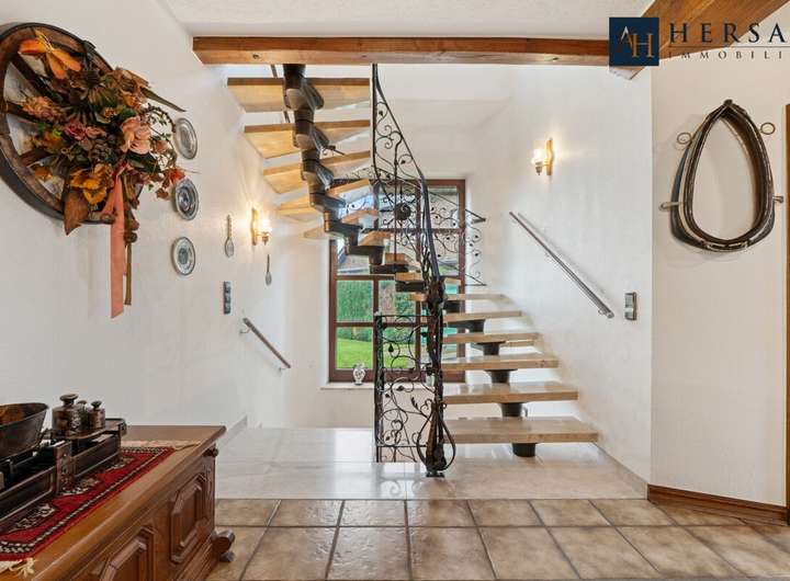 Zwei großzügige Balkone erweitern das Wohngefühl im Obergeschoss und bieten schöne Ausblicke in den Garten. Eine einzigartige Marmortreppe verbindet die Etagen und verleiht dem Haus einen eleganten Charakter.