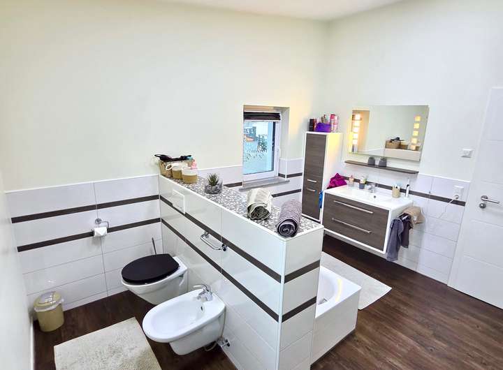 Und das moderne Tageslichtbad ist mit Dusche, Badewanne, WC und Bidet ausgestattet, ein Ort zum Entspannen und Wohlfühlen.