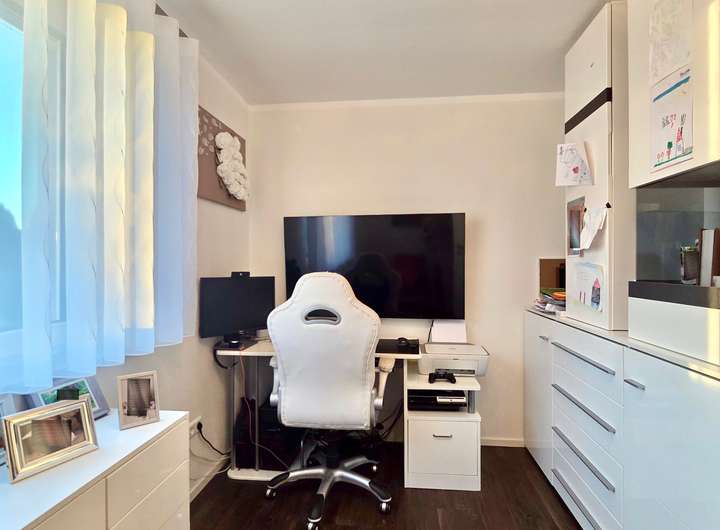 Neben dem Herzstück des Hauses befinden sich im Erdgeschoss eine Garderobe, ein Gäste-WC, der Technikraum sowie ein weiteres, separat zugängliches Zimmer, das sich perfekt als Homeoffice oder Gästezimmer anbietet.