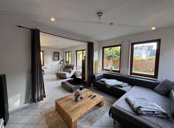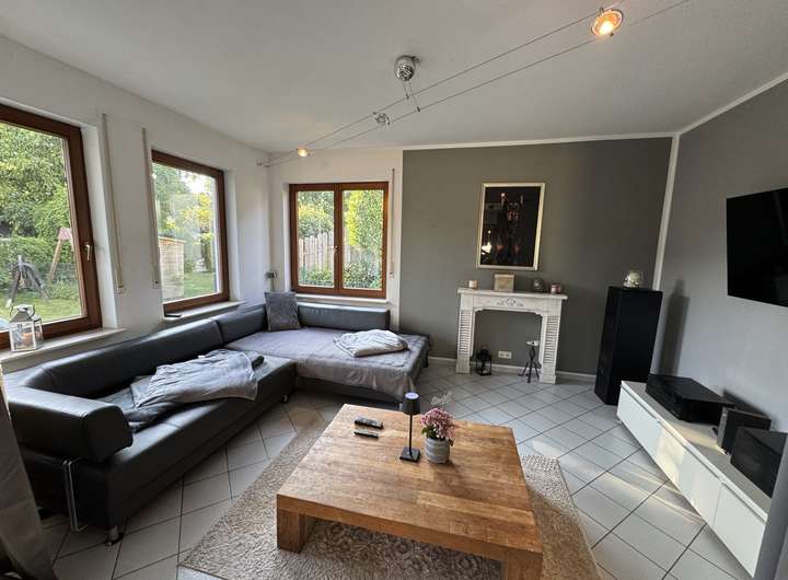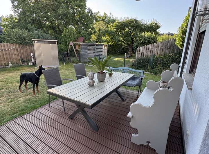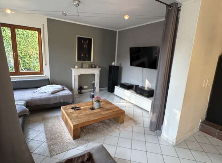 Der offen gestaltete Wohn- / Essbereich bildet das Herzstück der Wohnung. Ein Kamin im Essbereich sorgt für eine behagliche Atmosphäre an kühleren Tagen. Von dort aus gelangt man direkt auf die stilvolle Terrasse, welche mit dunklen Holzdielen, vom restlichen Garten abgegrenzt ist. Der große Garten bietet viel Platz für Erholung, Freizeit oder geselliges Beisammensein.