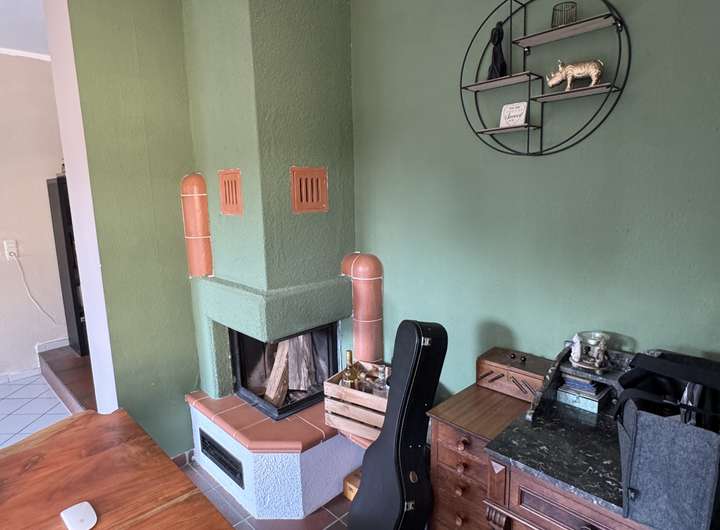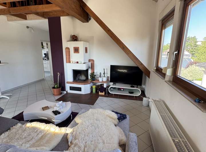 Das offen gestaltete Wohnzimmer beeindruckt besonders durch das sichtbare, rustikale Gebälk, das dem Raum ein warmes, stilvolles Ambiente verleiht. Ein Kamin sorgt für gemütliche Stunden und unterstreicht den besonderen Wohncharakter. Von hier aus gelangen Sie direkt auf den Balkon. Ein perfekter Ort, um den Blick ins Freie schweifen zu lassen.