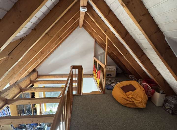 Ein besonderes Highlight ist der offene Schlafbereich unter dem Dach in der Galerie. Über eine stilvolle Innentreppe direkt vom Wohnzimmer aus erreichbar, schmiegt sich das Schlafzimmer charmant in die offene Dachkonstruktion ein. Von der Galerie aus eröffnet sich ein reizvoller Blick hinunter in das Wohnzimmer. Ein echtes architektonisches Statement mit Loft-Flair.