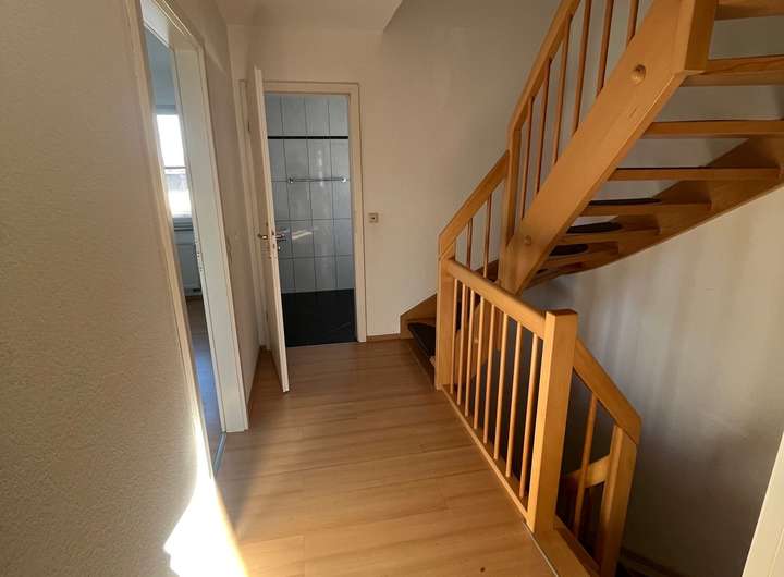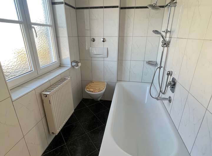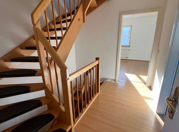 OG: 2 Zimmer mit Laminatboden, Bad mit Badewanne, Waschbecken.