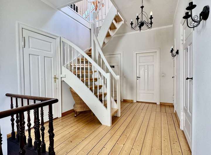 Vom Entrée führt die elegante Treppe in das Obergeschoss, in dem sich insgesamt vier Schlafzimmer befinden – zwei zur Straßenseite, zwei zur Gartenseite. Eines der gartenseitigen Zimmer verfügt zusätzlich über eine eigene kleine Dachterrasse. Darüber hinaus bietet das Obergeschoss ein innenliegendes Duschbad sowie ein großzügiges Hauptbad mit Badewanne, Dusche und Blick in den Garten.