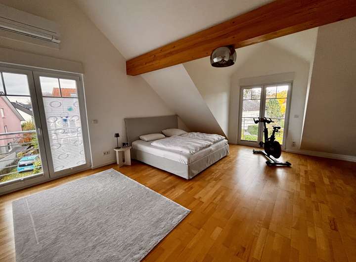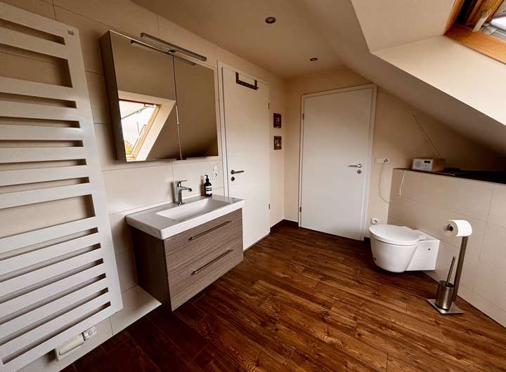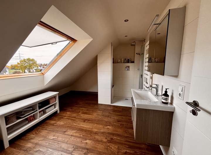 Im 2.OG befindet sich ein weiteres großzügiges und lichtdurchflutetes Zimmer mit Klimaanlage (Neu in 2024 - auch für Wärme nutzbar) sowie eine weiteres Tageslichtbad mit Dusche. Neben dem Bad gibt es noch eine Abstellkammer in der auch die Heizung untergebracht ist.
