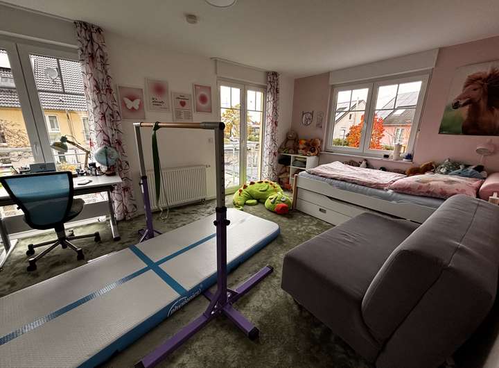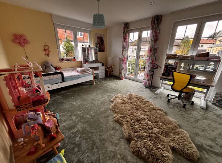 Die Kinderzimmer sind derzeit mit Teppichboden ausgestattet. Darunter liegt noch ein Laminatfußboden wie im Flur.