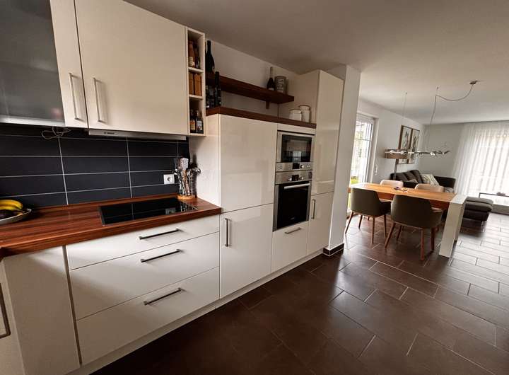 Im EG befindet sich neben dem Gäste-WC, dem Eingangsbereich noch das große Wohnzimmer mit offener Küche. In der EBK sind folgende Geräte enthalten: