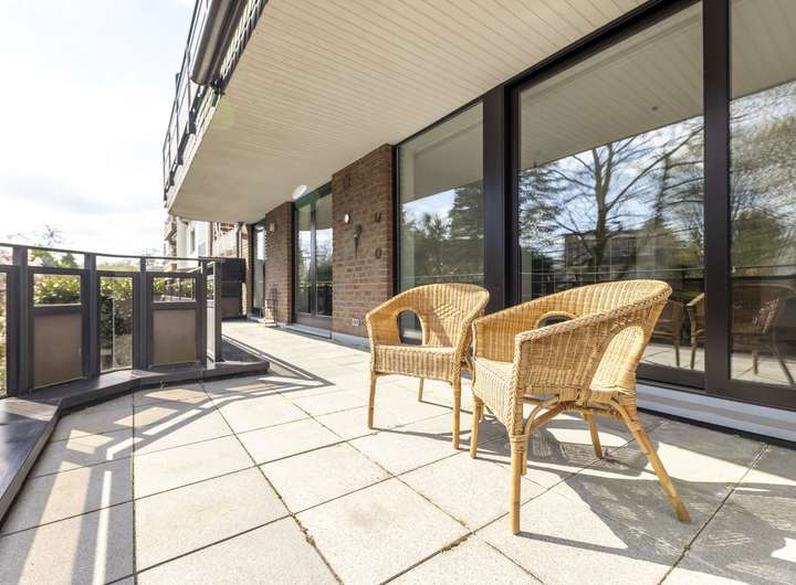 Die großzügig geschnittene 3-4-Zimmer-Wohnung befindet sich in der Hochparterre und ist über wenige Stufen vom Hauseingang begehbar. Neben zwei Schlafzimmern umfasst die Einheit eine Küche sowie zwei großzügige Wohn- und Essbereiche. Vom Wohnbereich, der Küche und einem Schlafzimmer der Einheit ist der große Balkon zu begehen, der sich über die komplette Breite des Hauses zieht. Neben dem Badezimmer mit Dusche steht ein Gäste-WC zur Verfügung. Es ist möglich und war ursprünglich in der Planung vorgesehen, den großen Essbereich durch eine Wand zu trennen, um somit ein weiteres Schlafzimmer zu erhalten.