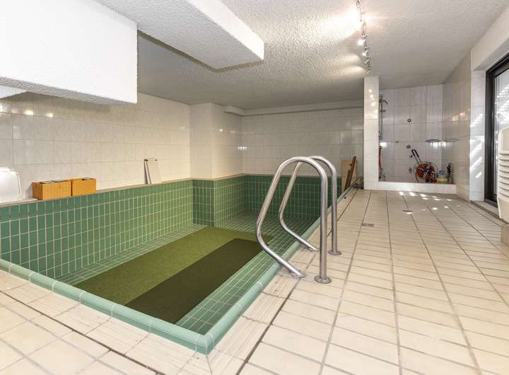 Die Einheit im Gartengeschoss umfasst drei Räume, eine Küche sowie ein Badezimmer mit Dusche und Badewanne. Von hier aus ist über eine weitere Treppe das Kellergeschoss direkt erschlossen. Hier befindet sich ein Pool mit Sondernutzungsrecht, welcher derzeit stillgelegt ist. Ebenfalls steht ein großer Keller- und Abstellraum zur Verfügung.