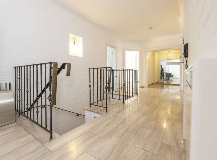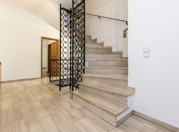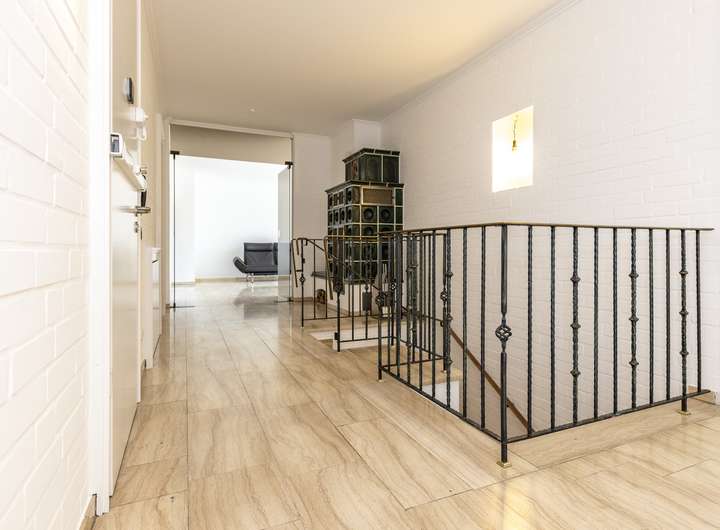 Die Fenster sind sehr hochwertig und bestehen aus Aluminium. Alle direkten Zugänge zum Haus sind zusätzlich mit Schließmechanismen gesichert. Im Gartengeschoss wurden zur gesteigerten Sicherheit geschmiedete Gitter angebracht. Die Heizung wird über Gas betrieben und die Warmwasserversorgung über eine neu eingebaute Wärmepumpe gesichert. In beiden Einheiten wurden hochwertige Böden aus Holz, Stein sowie Fliesen verlegt. Die aktuellen Eigentümer haben das Objekt vor einigen Jahren grundlegend modernisiert und seither sehr gut gepflegt.
