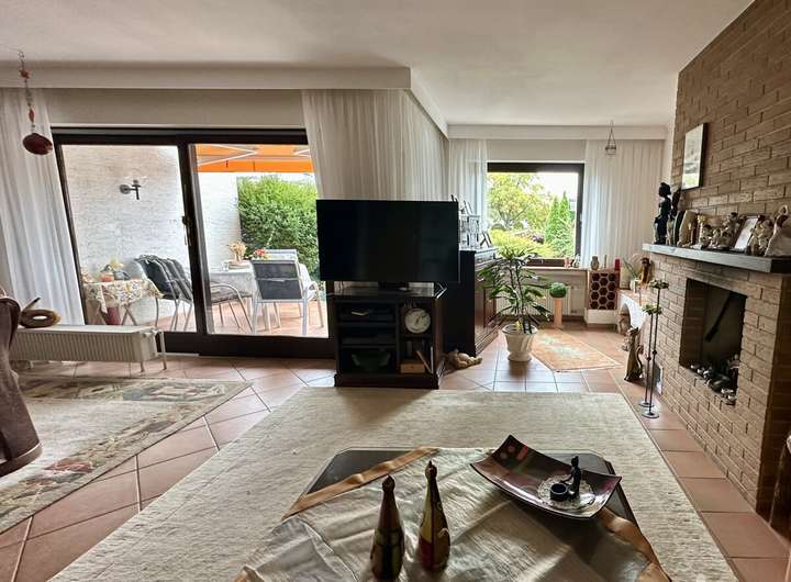 •Großzügiges Wohnzimmer mit Kamin und Zugang zur Terrasse und zum Garten