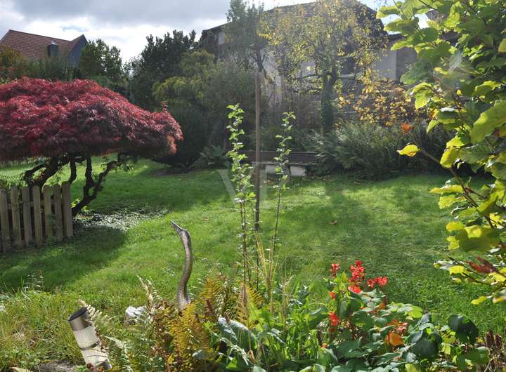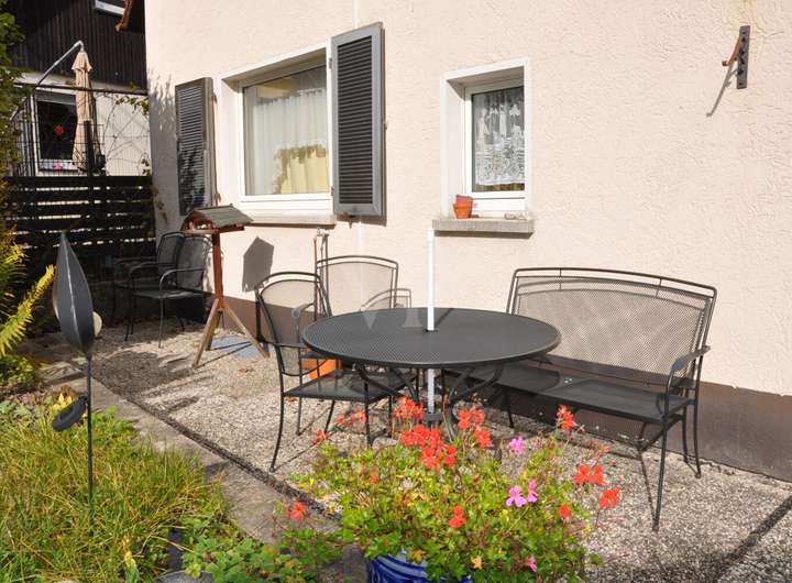 Die direkt am Haus angrenzende Terrasse bietet einen Blick ins Grüne und lädt zum Entspannen im Freien ein, der kleine, pflegeleichte Garten – perfekt für gemütliche Stunden.