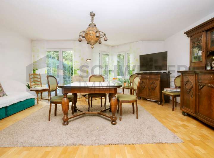 Im Erdgeschoss überzeugt der lichtdurchflutete Wohnbereich mit Parkettboden, Erkerfenster und direktem Zugang zur sonnigen Südterrasse mit kleinem Garten – perfekt für entspannte Stunden im Freien. Die angrenzende große Küche fügt sich harmonisch in das Wohnkonzept ein, während ein Gäste-WC zusätzlichen Komfort bietet.