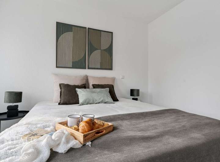 Durch eine Nische, dadurch etwas versteckt, gelangen wir in das Hauptbad und Schlafzimmer. Das Tageslichtbad ist versehen mit einer (Regen-)Dusche und Eckbadewanne - ein kleiner Wellnessort, und angenehmer Tagesstart! Gleich nebenan: das große Schlafzimmer, welches genügend Platz für Schränke, Kommoden und/oder Ankleidebereich bietet.