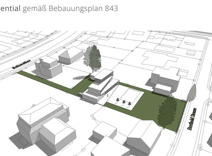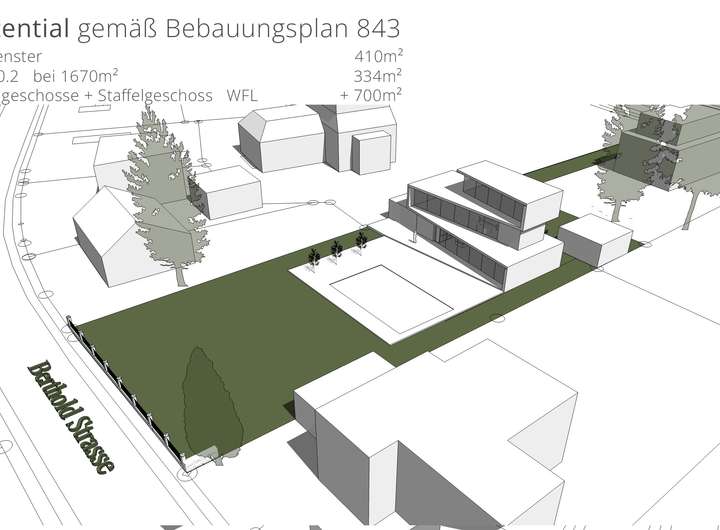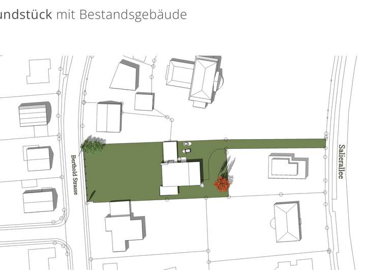 Das rund 1700m² grosse Grundstück, welches sich von der Salierallee bis zur Berthold Strasse erstreckt, bietet ausreichend Platz, um mit einer stimmigen Architektur zu einem Familiensitz für Generationen werden zu können.