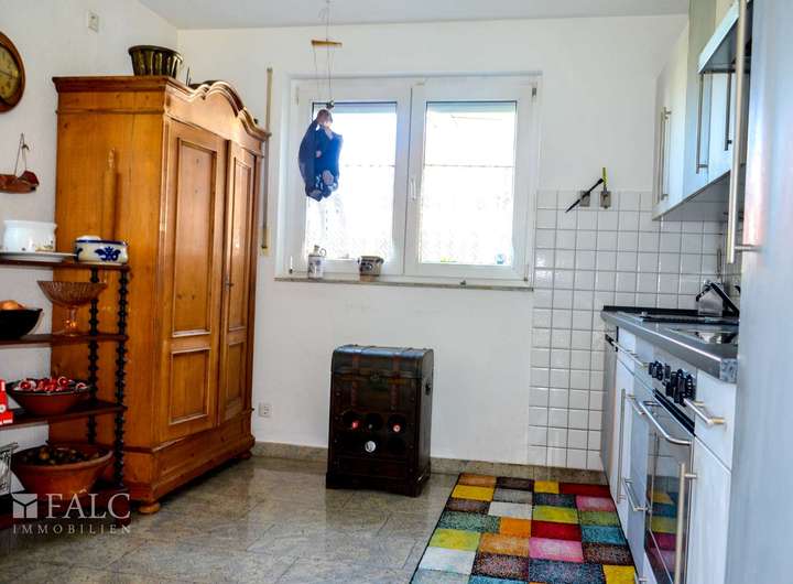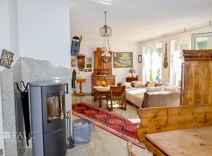 Das Herzstück des Hauses ist der großzügige Wohn- und Essbereich mit bodentiefen Fenstern, der direkten Zugang zur großen Sonnenterrasse und dem liebevoll angelegten Garten bietet. Hier genießen Sie entspannte Stunden und einen unverbaubaren Weitblick über Felder und Wälder.