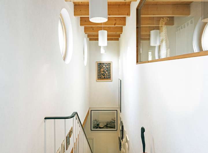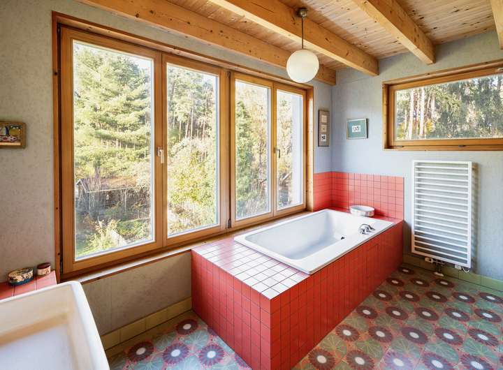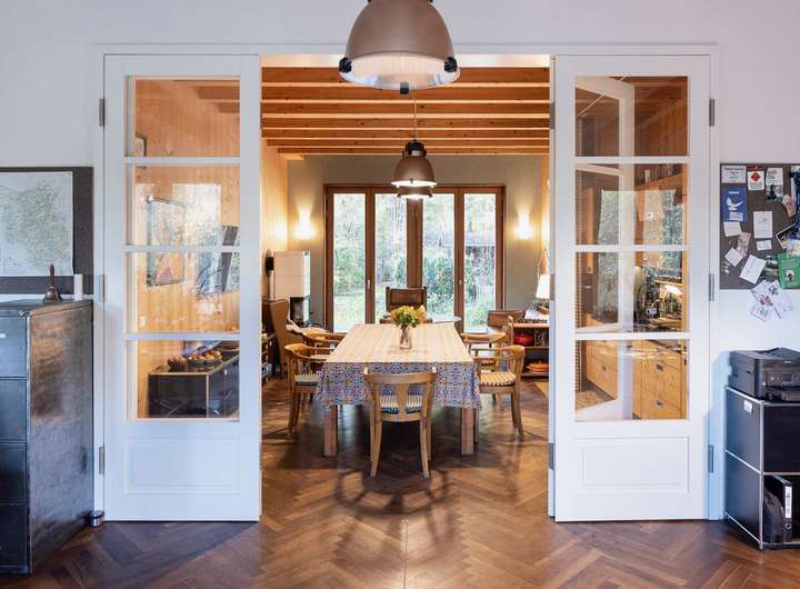 - Fischgrätenparkett, 30er-Jahre Türklinken, VIA-Zementfliesen, Thermoholzfassade