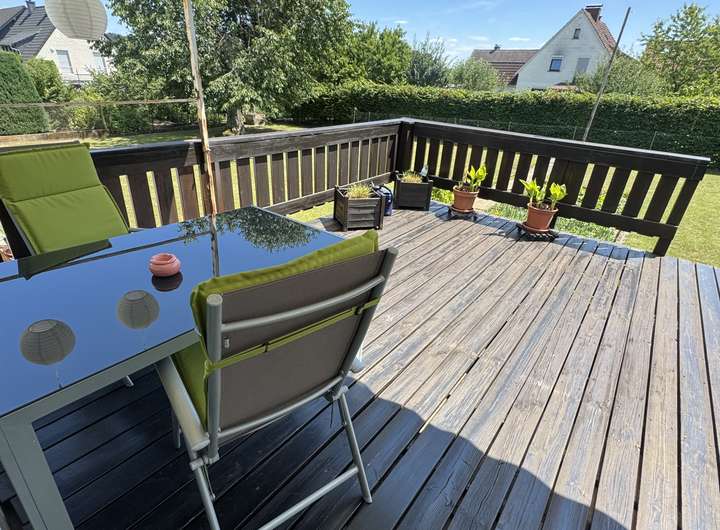 Von der Dachterrasse sowie der Terrasse im Erdgeschoss aus haben Sie direkten Zugang zu dem großen, gepflegten Garten.