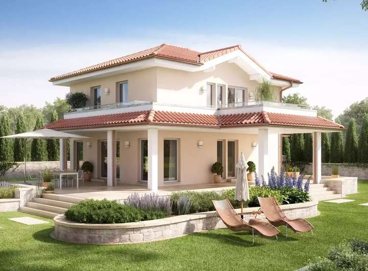 Ins Auge fällt die umlaufende Terrassenüberdachung, die den Stil des Walmdachs aufgreift und von weißen Säulen getragen wird.