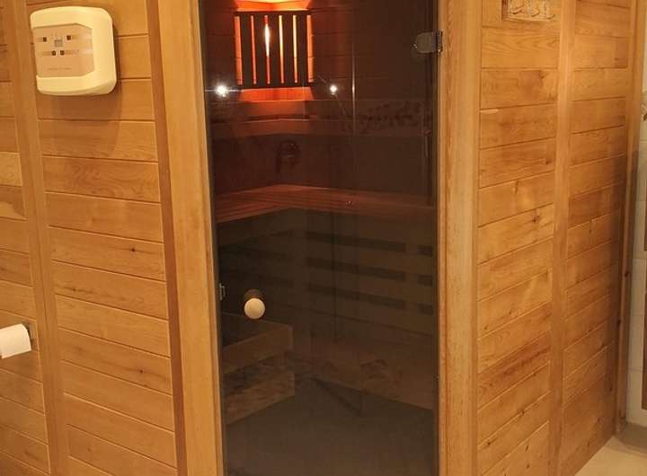 Wellnessbereich mit Sauna, Pool und Whirlpool. In der oberen Etage sind 2 Schlafräume klimatisiert.