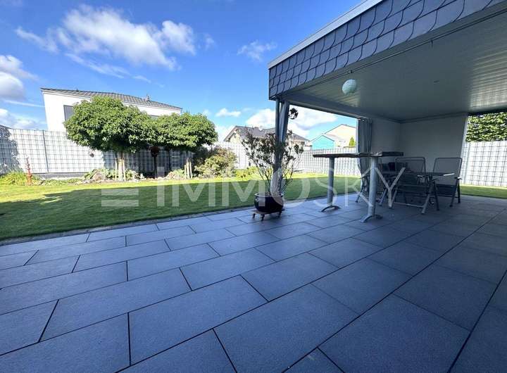 Von der Wohnlandschaft gelangen Sie auf die überdachte Terrasse mit Blick in den liebevoll angelegten Garten.