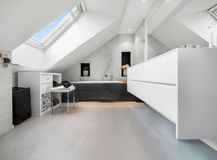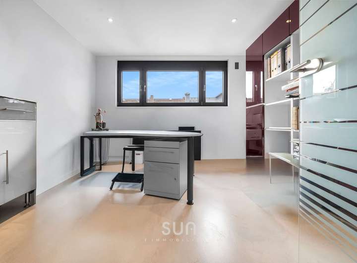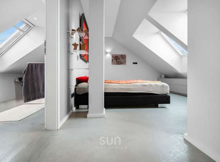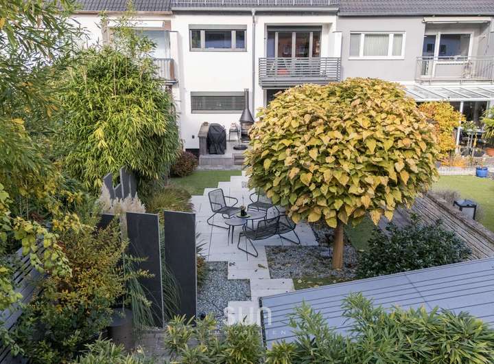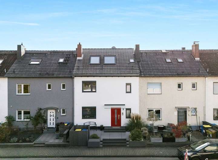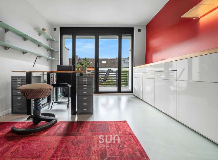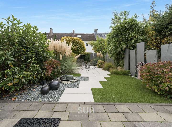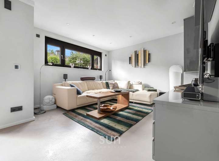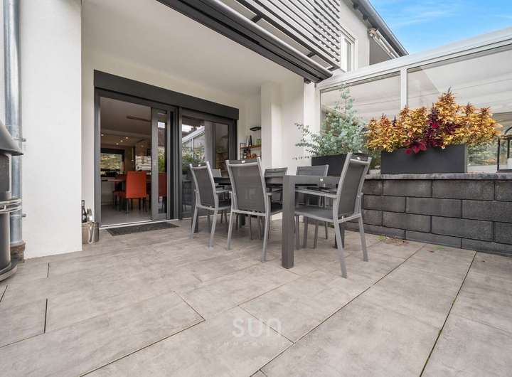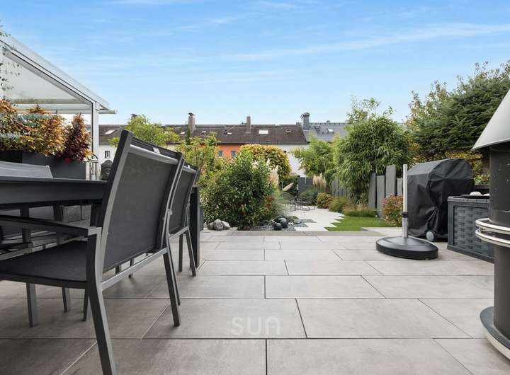 Im Inneren erwartet Sie ein lichtdurchfluteter Wohn-Essbereich mit direktem Zugang zum Garten und einer hochwertigen Einbauküche (zzgl. 20.000 €), ausgestattet mit modernsten Geräten. Zwei Tageslichtbäder, ein separates Gäste-WC und eine begehbare Ankleide mit maßgefertigten Einbauten bieten höchsten Komfort. Technisch überzeugt das Haus mit einem KNX-Smart-Home-System, Sonos-Soundsystem, dimmbarem Lichtkonzept, Dachfenstern mit Regensensor, Ecowater-Entkalkungsanlage und einer Fußbodenheizung in allen Etagen.