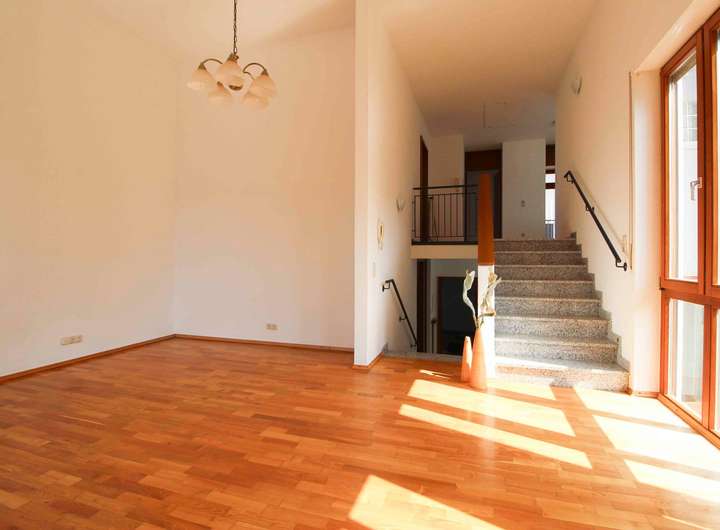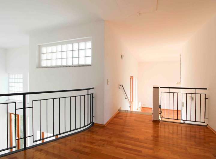 Ein architektonisches Highlight ist die mittlere Ebene mit dem großzügigen Wohnzimmer. Hohe Decken, große Fensterflächen und der offene Blick sowohl nach draußen als auch hinunter zum Essbereich schaffen hier eine besondere Wohnqualität. Im Obergeschoss befinden sich der Schlafbereich mit zwei Schlafzimmern sowie ein weiteres großes Badezimmer. Von der Empore aus genießen Sie den Blick in das Wohnzimmer und weiter ins Grüne, wodurch ein einzigartiges Raumgefühl entsteht. In Wohnzimmer und Obergeschoss sorgt edler Parkettboden für eine warme Wohnatmosphäre.