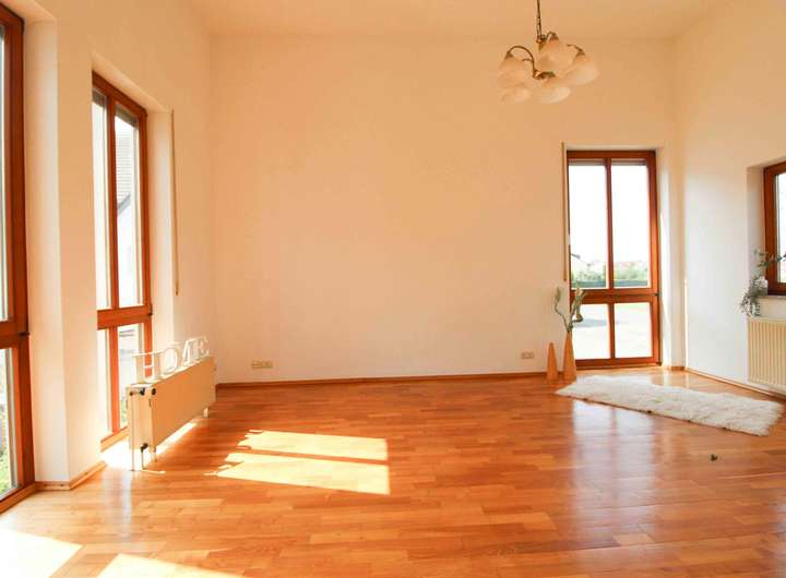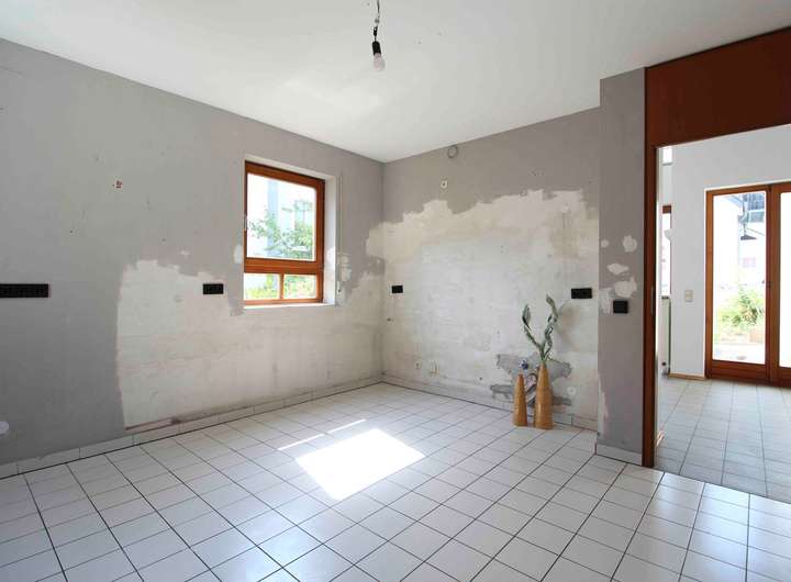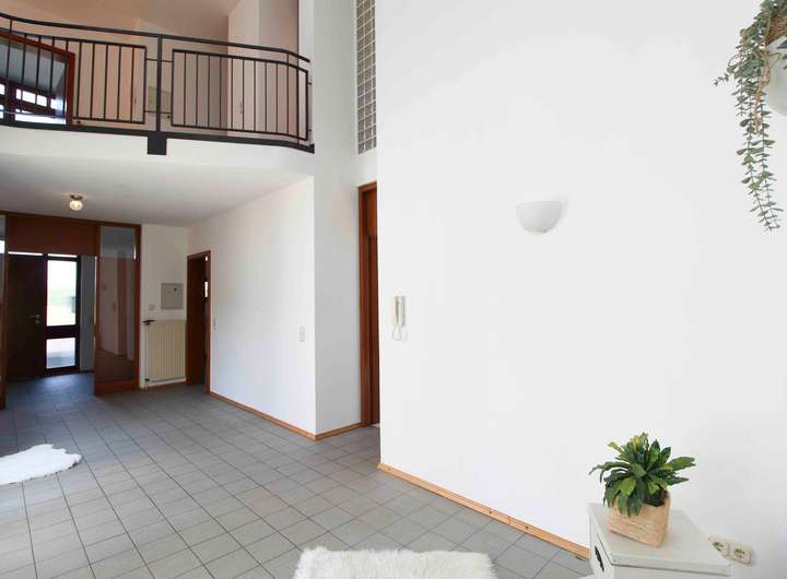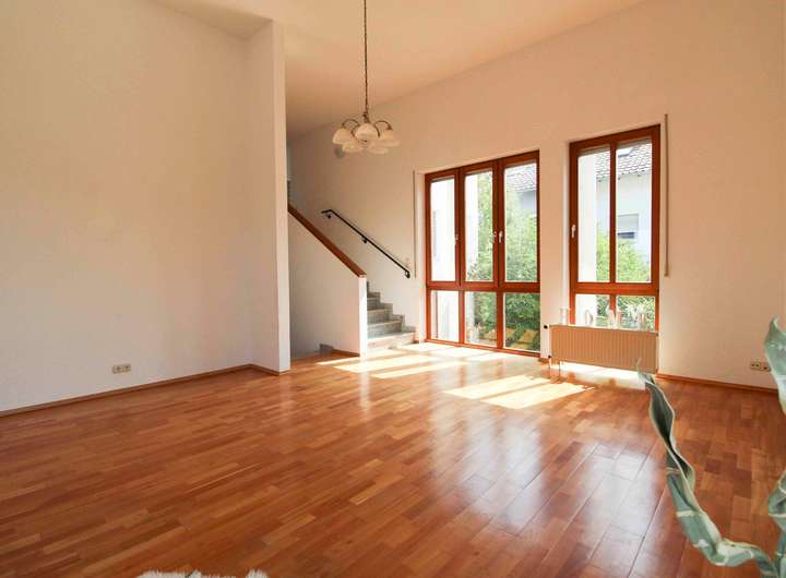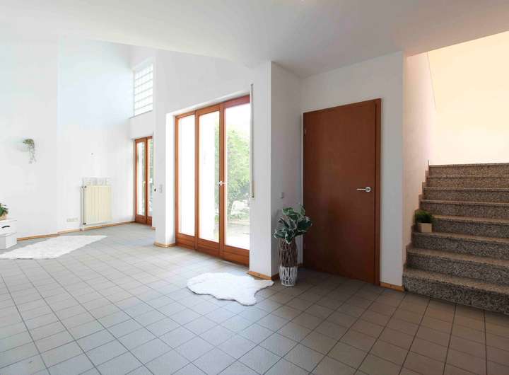Das 1991 erbaute Haus präsentiert sich heute in einem einladenden Zustand und bietet auf rund 145 m² Wohnfläche eine harmonische Kombination aus Großzügigkeit, Licht und durchdachter Architektur. Schon beim Betreten empfängt Sie ein geräumiger Eingangsbereich mit Platz für eine Garderobe, der den ersten Eindruck von Helligkeit und Offenheit vermittelt. Bodentiefe Fenster lassen die Sonne in die Räume strömen und schaffen eine warme, einladende Atmosphäre. Im Erdgeschoss erwarten Sie neben einem Tageslichtbad mit Dusche und Badewanne auch eine Küche mit großer Speisekammer, die sich auf Wunsch zum Essbereich hin öffnen ließe, um ein modernes, offenes Wohngefühl zu schaffen. Ein weiteres Zimmer auf dieser Ebene eignet sich ideal als Büro oder Gästezimmer.