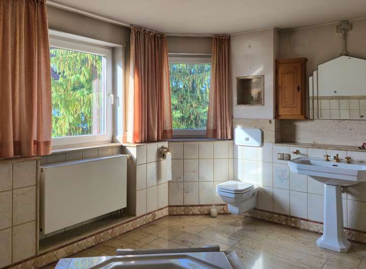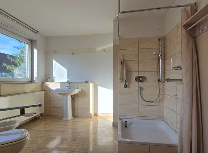 Dieses großzügige Einfamilienhaus aus dem Baujahr 1998 besticht durch seine geräumige Bauweise auf vier Ebenen und hochwertiger Ausstattung. Es verfügt über zwei Hauseingänge (Ostseite von der Straße aus und Südseite von dem Vorhof aus). Auf Wunsch ist eine Separierung in zwei Parteien möglich und über eine zweite Treppe vom östlichen Treppenhaus realisierbar.