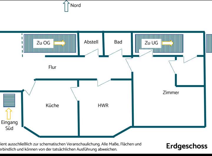 Das Erdgeschoss beherbergt einen Wohn-/Essbereich, eine Küche, einen derzeit als HWR genutzten Raum sowie ein weiteres abgeschlossenes Zimmer. Daneben gibt es ein Badezimmer und Abstellflächen.