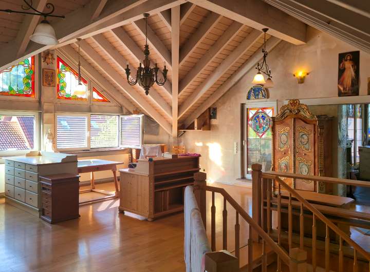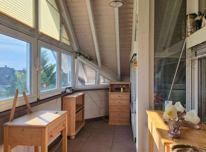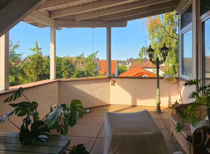 Im luftigen Dachgeschoss erwartet Sie eine offene Galerie, von der aus Sie zur Westseite eine großzügige, überdachte Loggia und einen Wintergarten betreten können. Zur Ostseite erwartet Sie ein Saunabereich mit Dusche und separatem WC sowie ebenfalls eine Loggia mit tollem Feldblick in Richtung Rodgau.