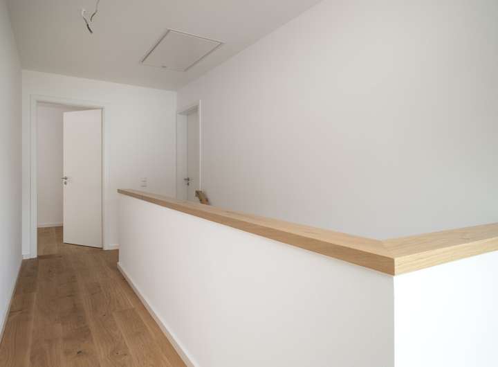 Das Erdgeschoss empfängt Sie mit einem offen gestalteten Wohn- und Essbereich, der dank der großzügigen Fensterflächen mit Tageslicht durchflutet wird und eine angenehm helle, freundliche Wohnatmosphäre schafft. Die angrenzende Küche fügt sich harmonisch ins Raumkonzept ein und bietet beste Voraussetzungen für moderne Wohnküche-Ideen. Großformatige Fliesen in den Bädern sowie einheitlich hochwertiges Echtholz-Parkett – Eiche Landhausdiele – unterstreichen das stimmige Designkonzept des Hauses. Ein Büro- oder Gästezimmer sowie ein Gäste-WC runden das Erdgeschoss funktional ab.