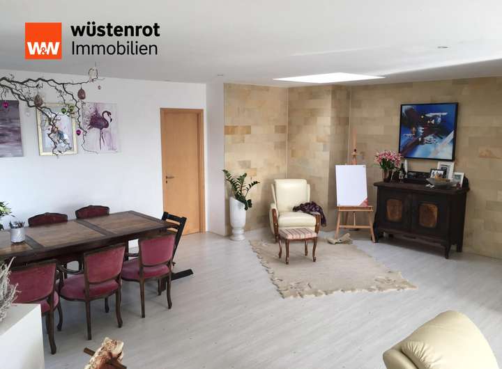 Das Highlight der Wohnung ist sicherlich der mit ca. 65m² großzügig gestaltete, offene und lichtverwöhnte Wohn-/ Essbereich, von dem Sie bequem auf Ihre noch größere Dachterrasse (reine Grundfläche ca. 76m²) gelangen. Die Terrasse bietet enorm viel Platz, um einige gemütliche Stunden im Freien zu verbringen und den herrlichen Weitblick zu genießen.