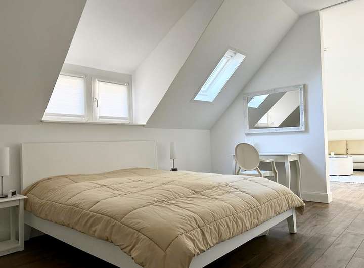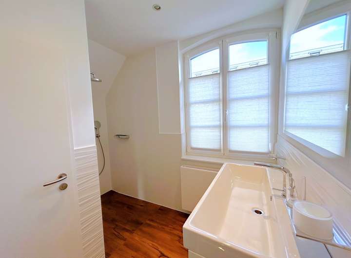 Das luftige Treppenhaus führt Sie in die obere Etage mit großem Flurbereich (Deckenhöhe über 4 m), 3 Zimmern, 2 Bädern, sowie der zweiten großen Dachterrasse mit Burgblick. Die drei Zimmer (je ca. 16 qm) können als Schlafzimmer, Kinderzimmer, Bibliothek etc. vielseitig genutzt werden. Ein weiteres Zimmer, welches hochwertig mit Echtholzparkett ausgestattet wurde, ist über eine maßangefertigte Massivholztreppe erreichbar.