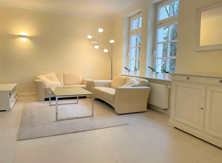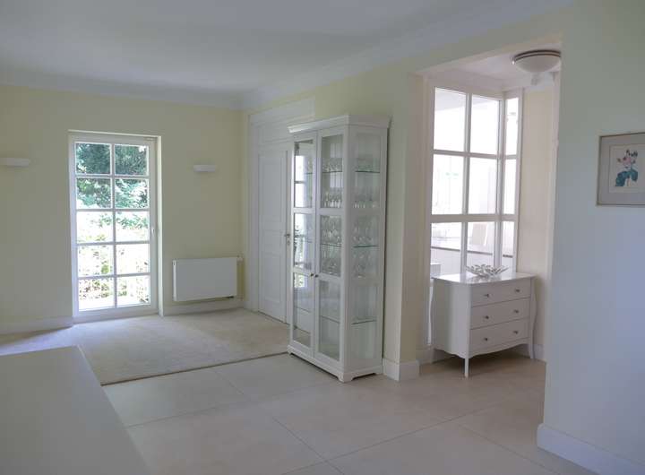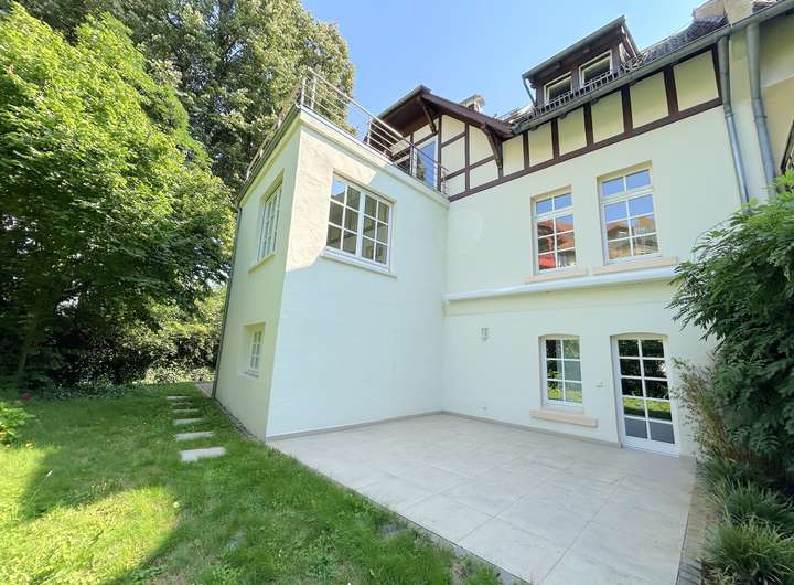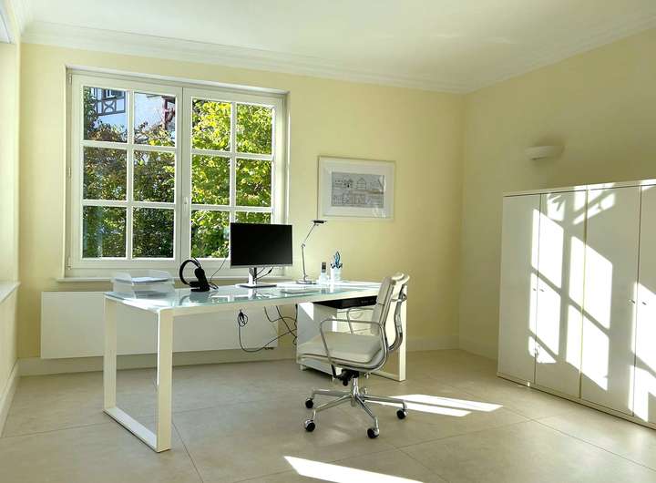 Sie betreten die Stadtvilla durch den geschmackvoll angelegten Vorgarten. Über das zentrale Treppenhaus und die Garderobe gelangen Sie in den großzügigen Wohn-/Essbereich des Hauses (52 qm, Esszimmer abtrennbar), an den sich ein Arbeitszimmer (15 qm) und die Küche (16 qm) anschließen. Alle Räume sind mit hochwertigen großformatigen, italienischen Fliesen ausgestattet und durch große Flügeltüren verbunden. Deckenhöhen von 2,7 m verleihen dem Haus ein großzügiges Raumgefühl. Über eine Außentreppe gelangen Sie direkt auf die erste uneinsehbare Terrasse mit eigenem Bachlauf.