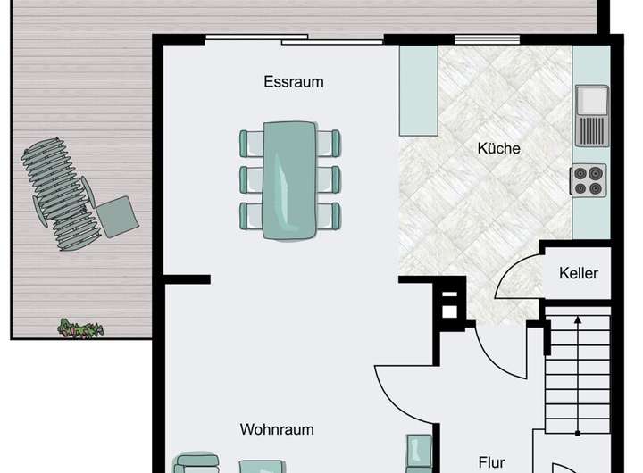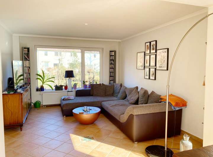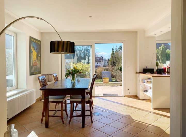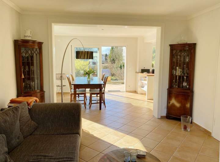 Herzstück der Immobilie ist der großzügige und helle Wohn- und Essbereit mit breiter Fensterfront und direktem Zugang in den Garten.