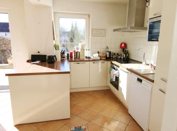 Die helle Einbauküche verfügt über alle elektrischen Geräte sowie genügend Stauraum.