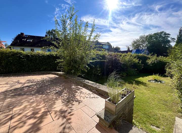 Zur Immobilie gehört eine sonnige Terrasse sowie ein Garten.