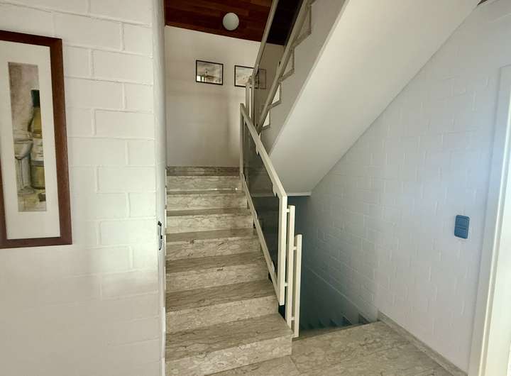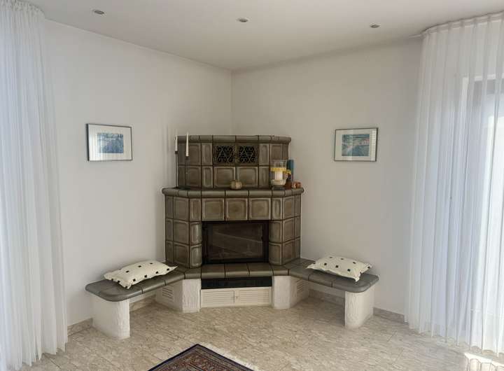 Hochwertiger Marmorboden in den Flurbereichen und im Wohnzimmer. Außerdem ist ein Kamin im Wohnbereich vorhanden.