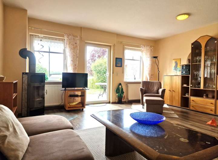-Wohnzimmer mit Kaminofen und Zugang zur Terrasse