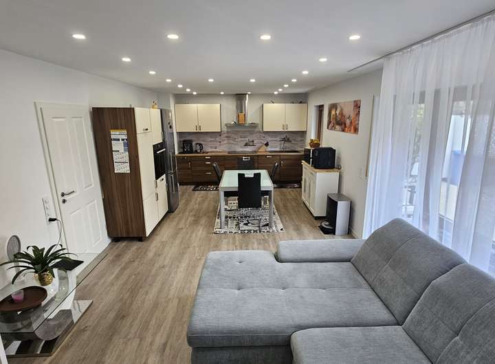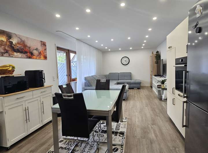 Geräumiges Wohnzimmer und Küche mit viel Tageslicht und mit direktem Zugang zur Terrasse
