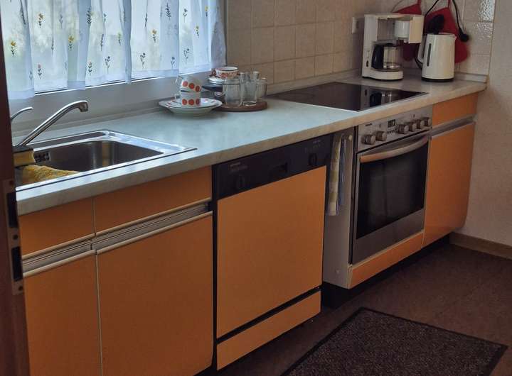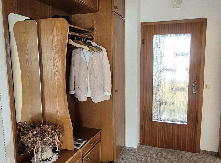 Im Erdgeschoß gelangt man in das Haus; über einen kleinen Windfang kommt man in einen geräumigen Flur, in dem genügend Platz für eine große Garderobe ist. Anschließend befindet sich eine Küche.