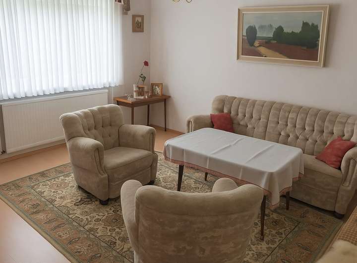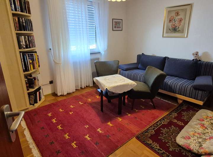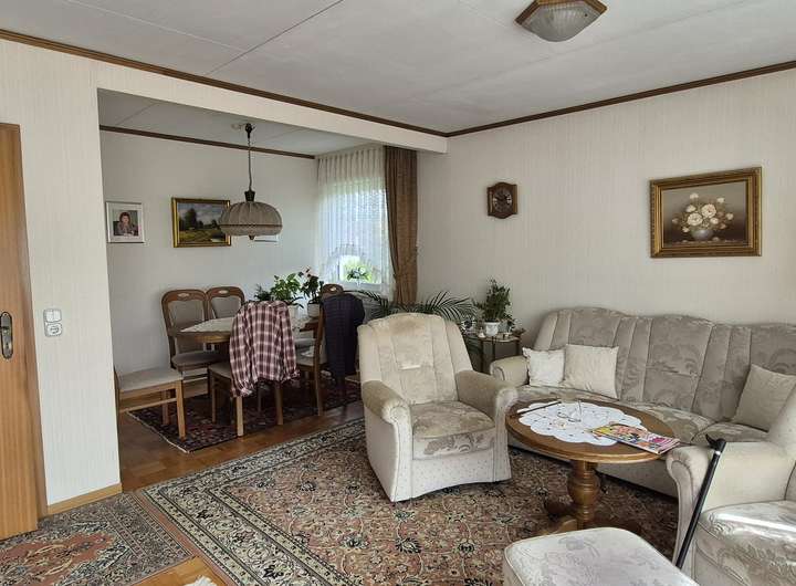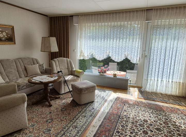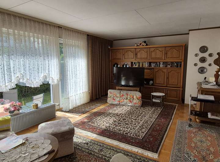 Das Herzstück ist ein sehr großes, helles Wohnzimmer mit Essecke und Zugang zur Terrasse/ Garten.