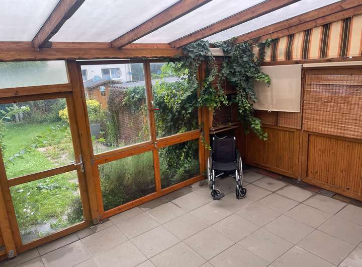 Terrasse: Wintergartenähnliche Holzüberdachung. Abschließbare Durchgangstür zum Garten. Abschließbares Schmiedeeisernes Tor zur Einfahrt
